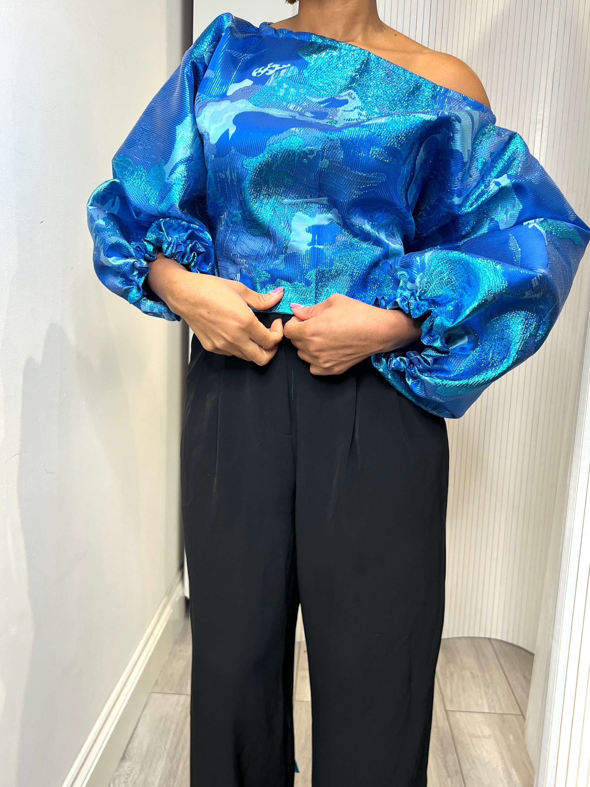 Blue metallic Jacquard Asymmetric Balloon Sleeve Blouse