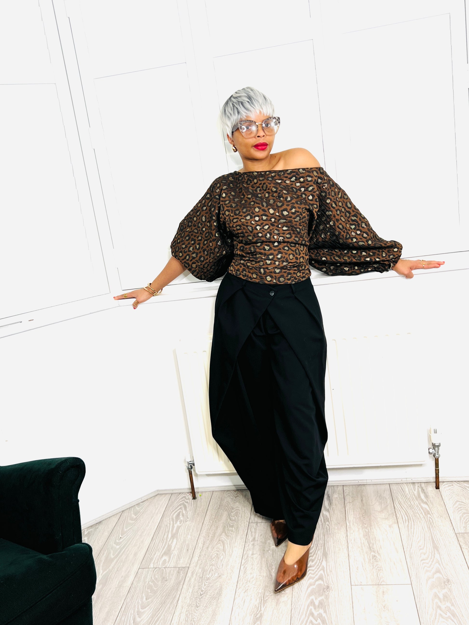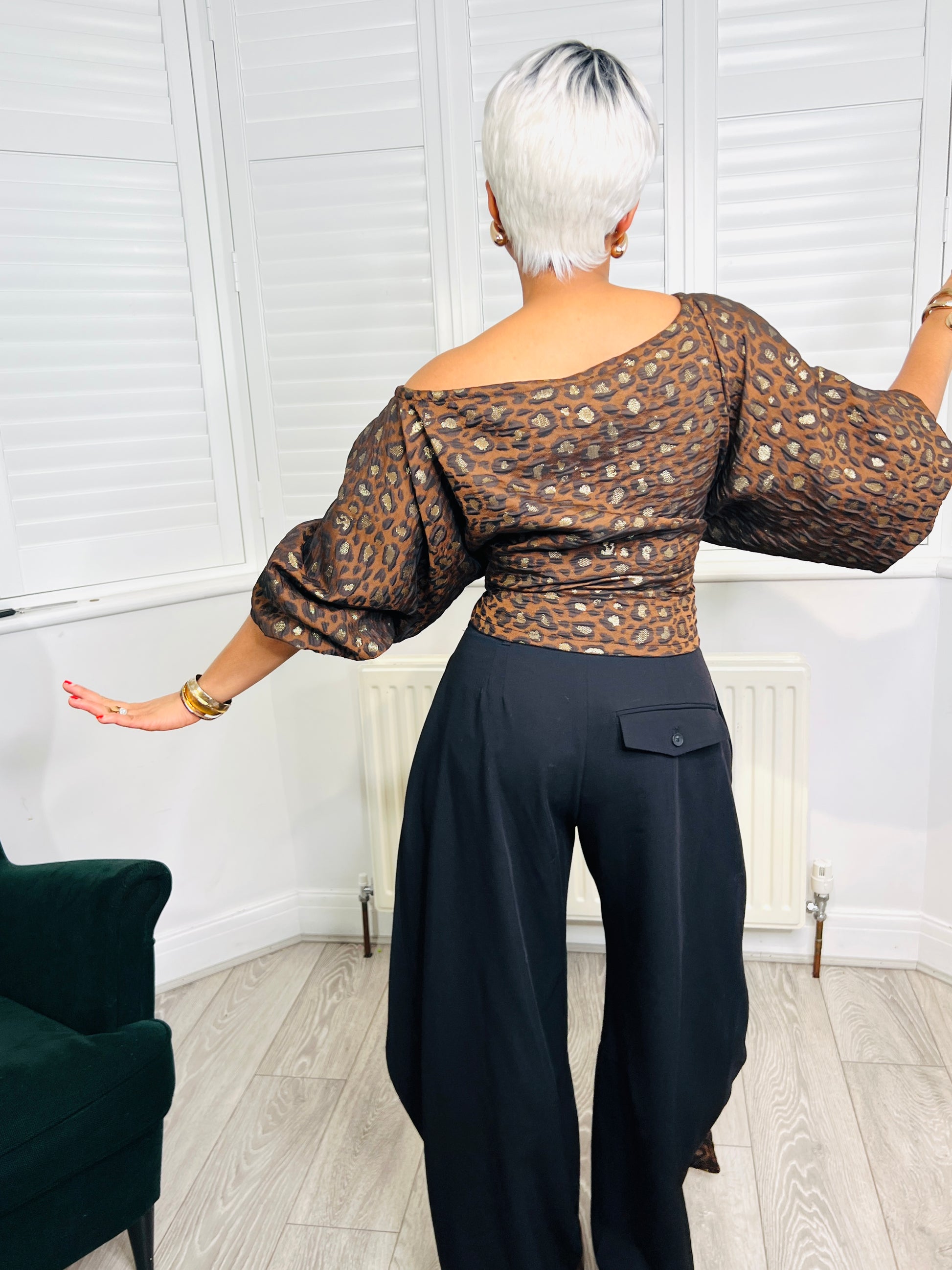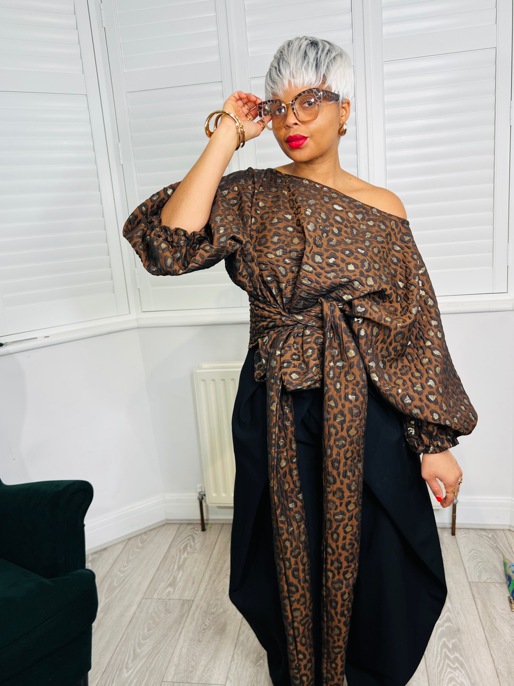 Brown leopard metallic Jacquard Asymmetric Balloon Sleeve Blouse