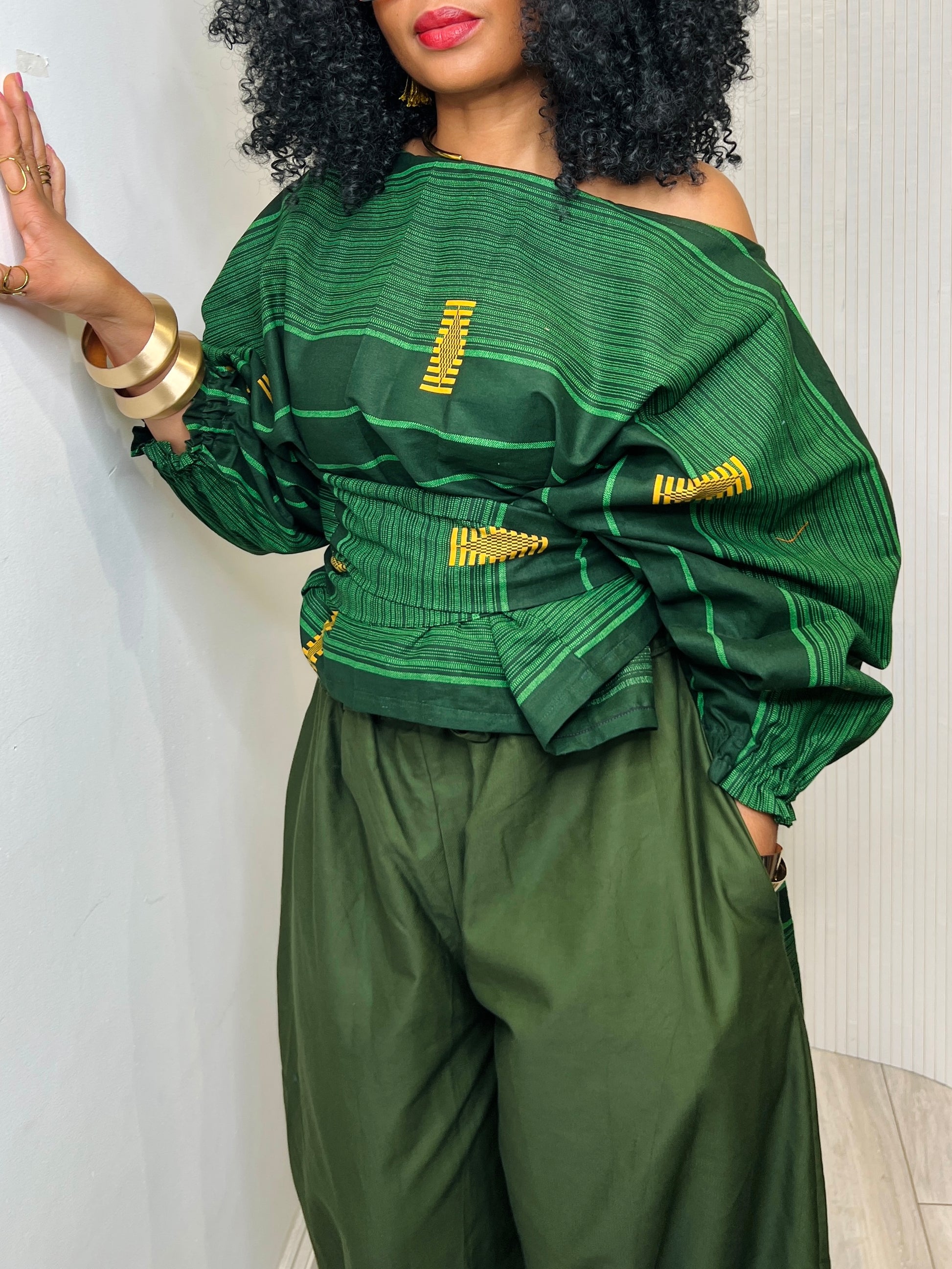 Dark green top: Asymmetric Balloon Sleeve Blouse
