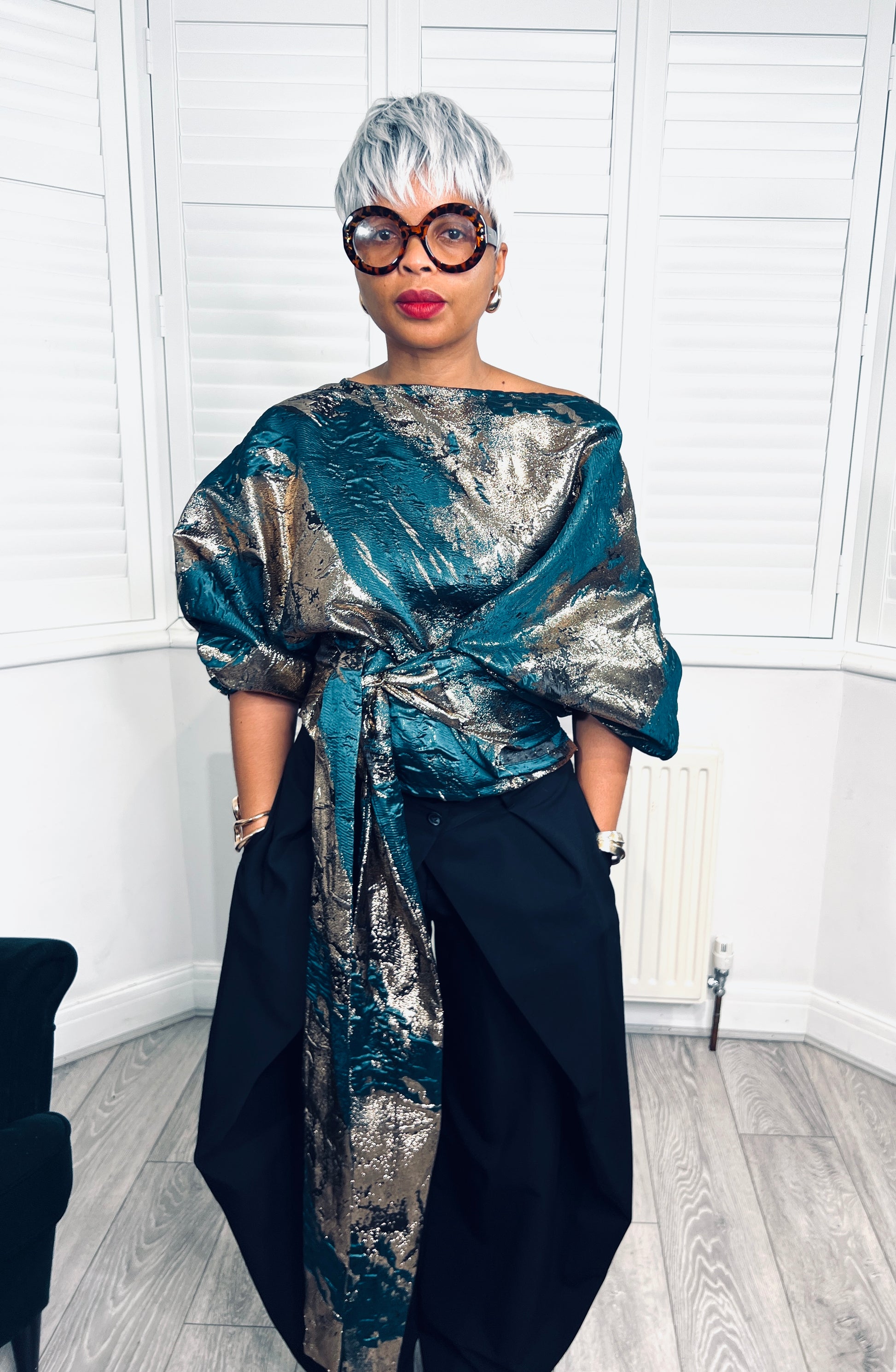 Green and gold metallic Jacquard Asymmetric Balloon Sleeve Blouse