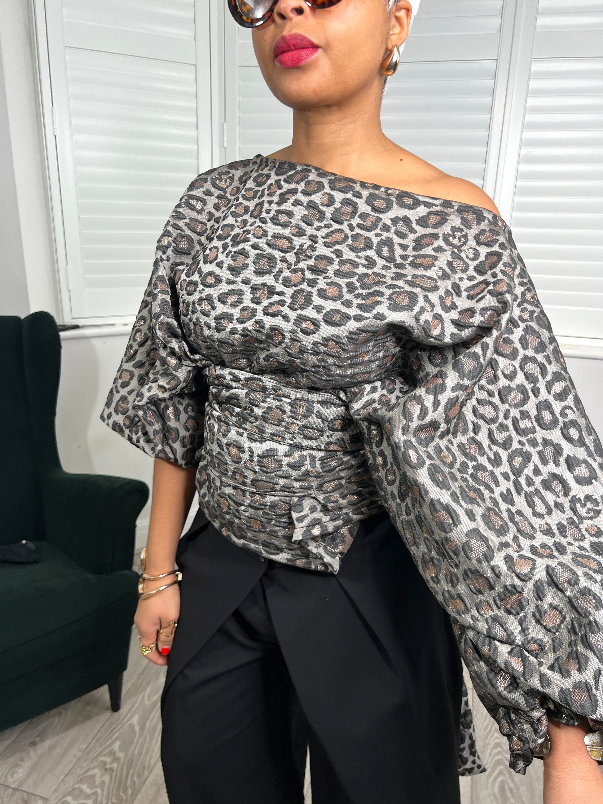 Grey leopard metallic Jacquard Asymmetric Balloon Sleeve Blouse