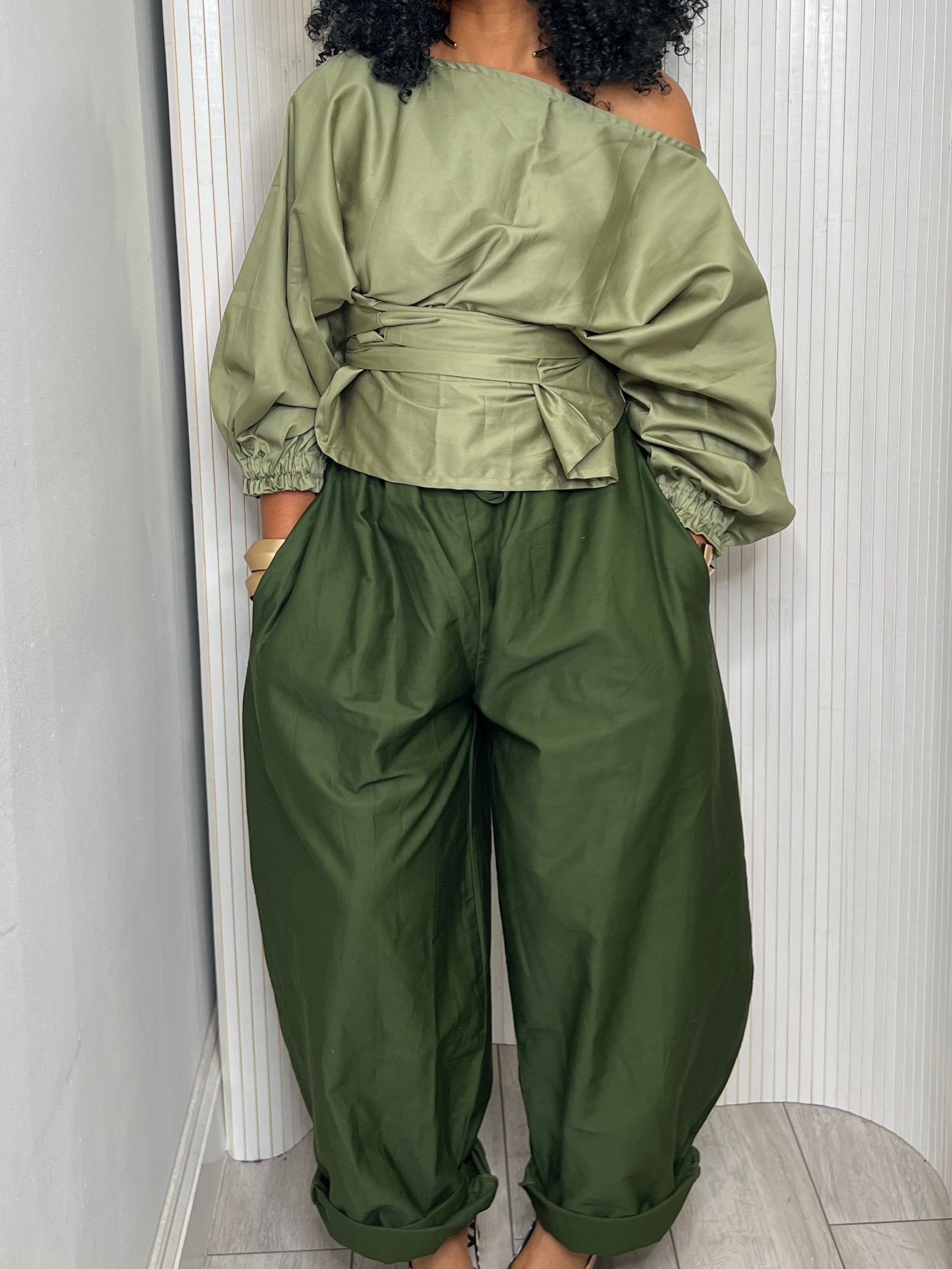 Khaki green Baloon trousers.