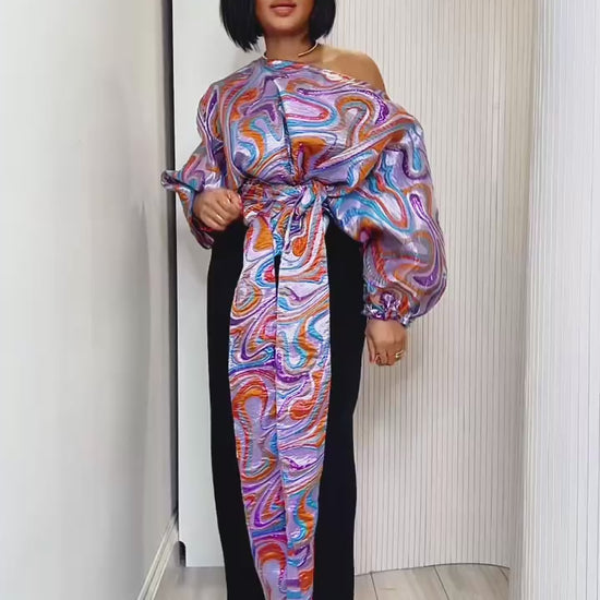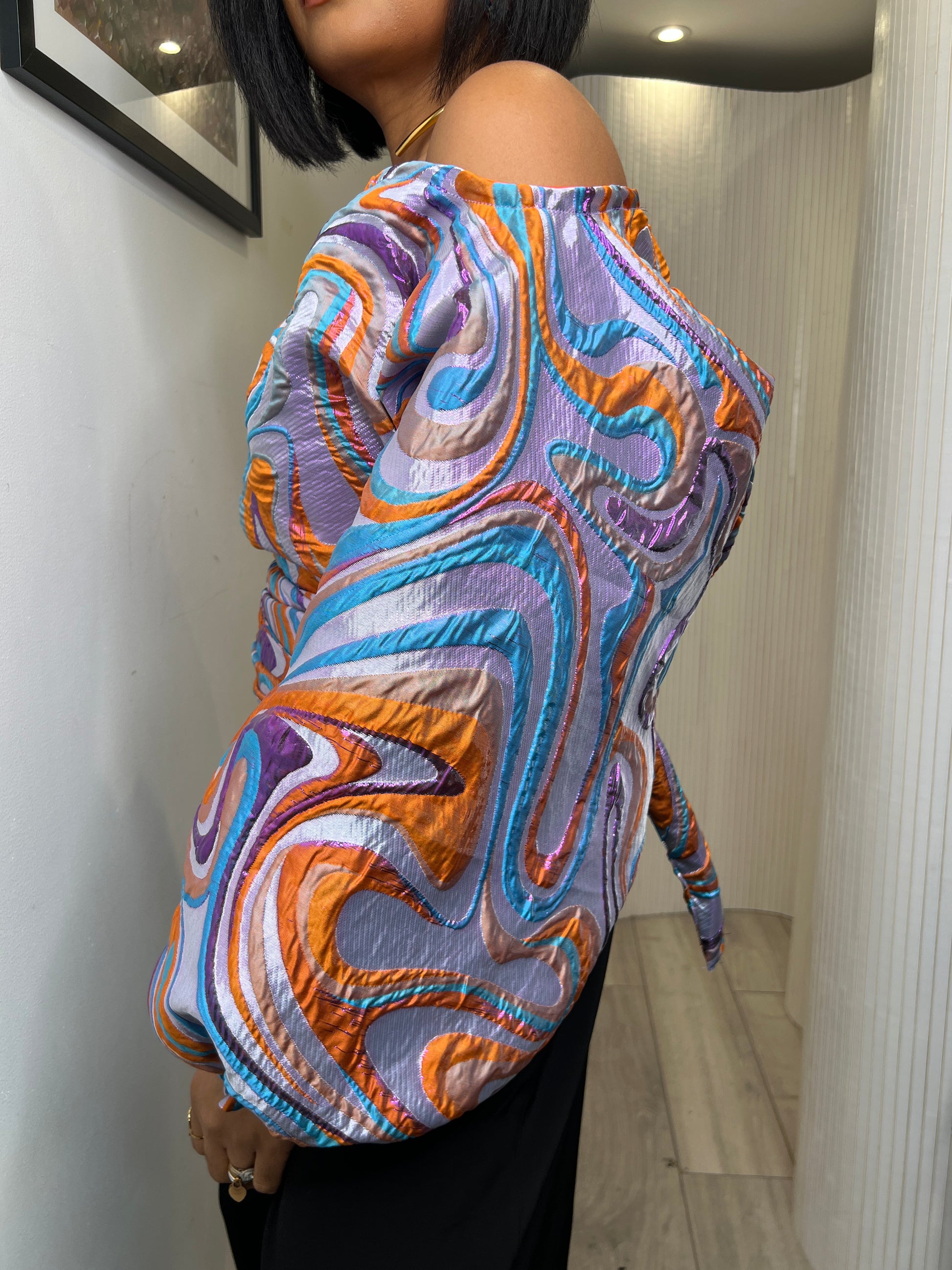 Lilac and orange organza brocade Jacquard Asymmetric Balloon Sleeve Blouse