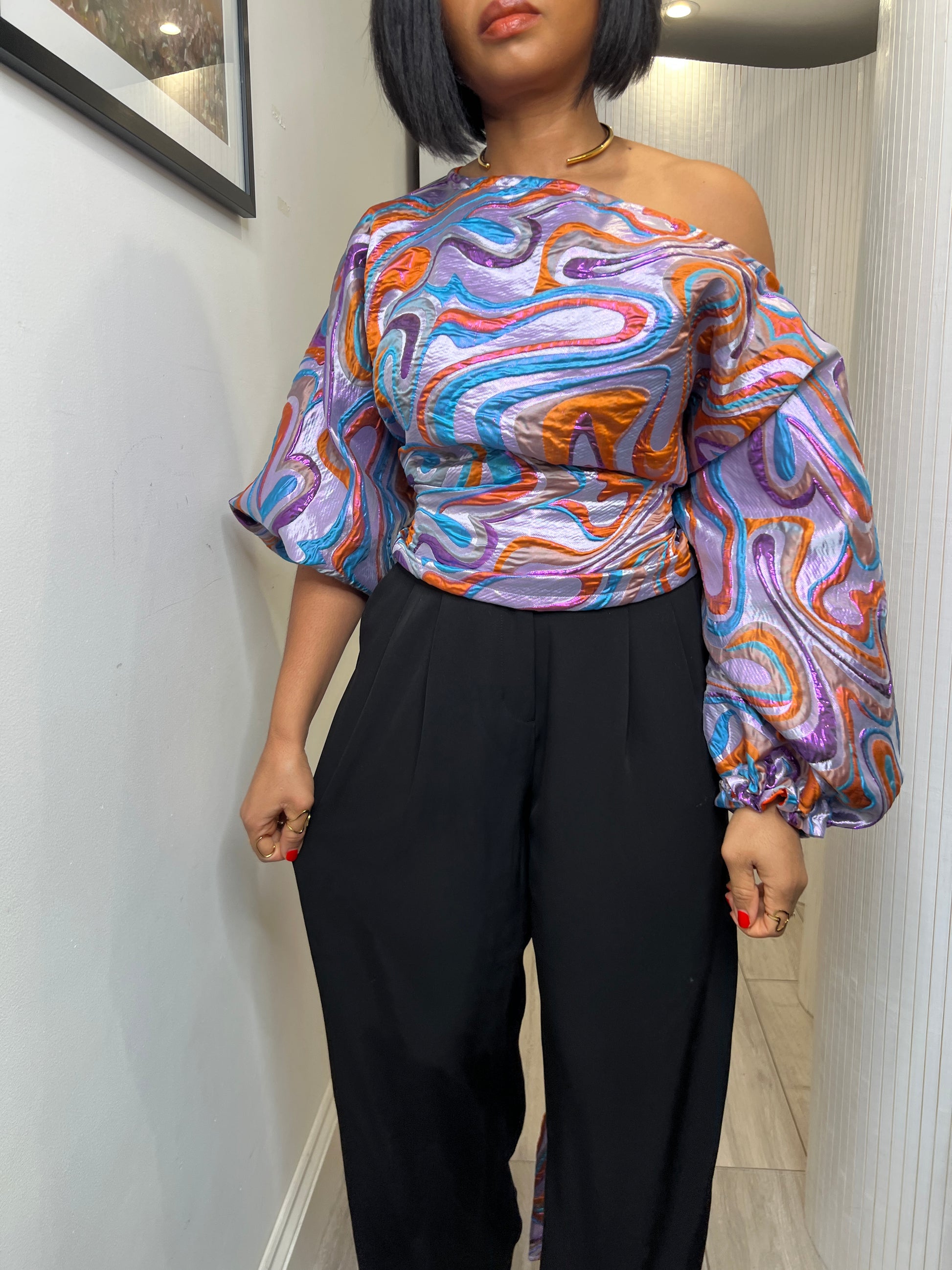 Featuring an asymmetric neckline and dramatic balloon sleeves, this top is perfect for the party season.