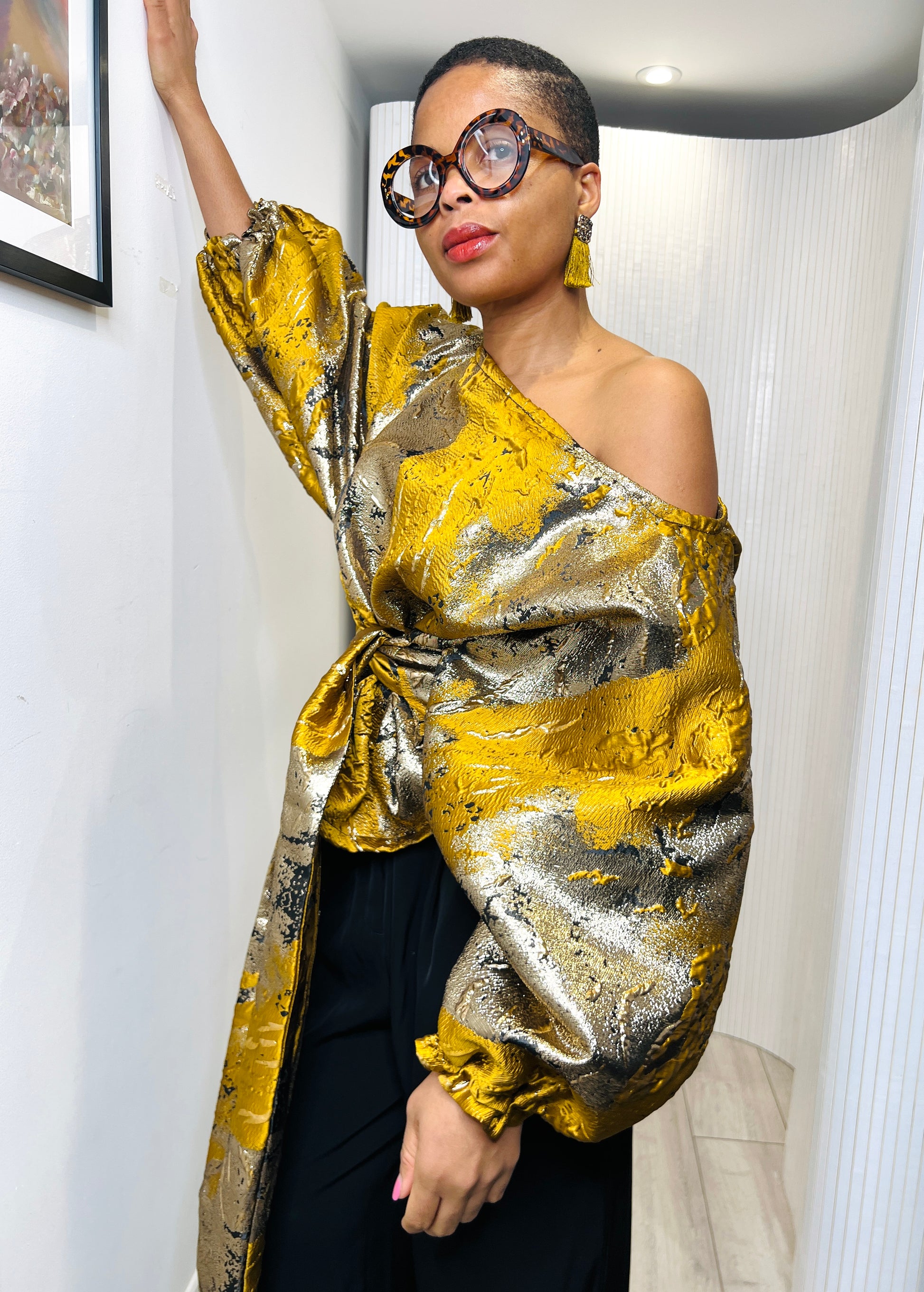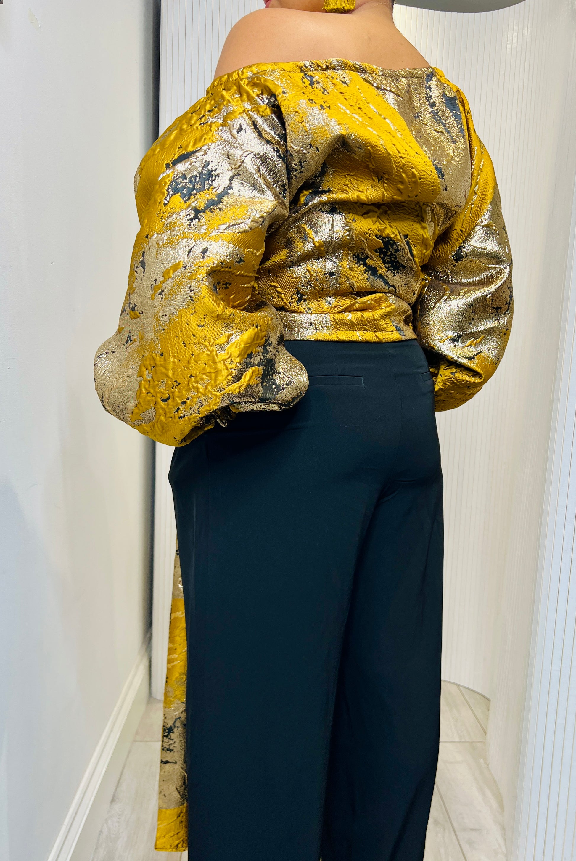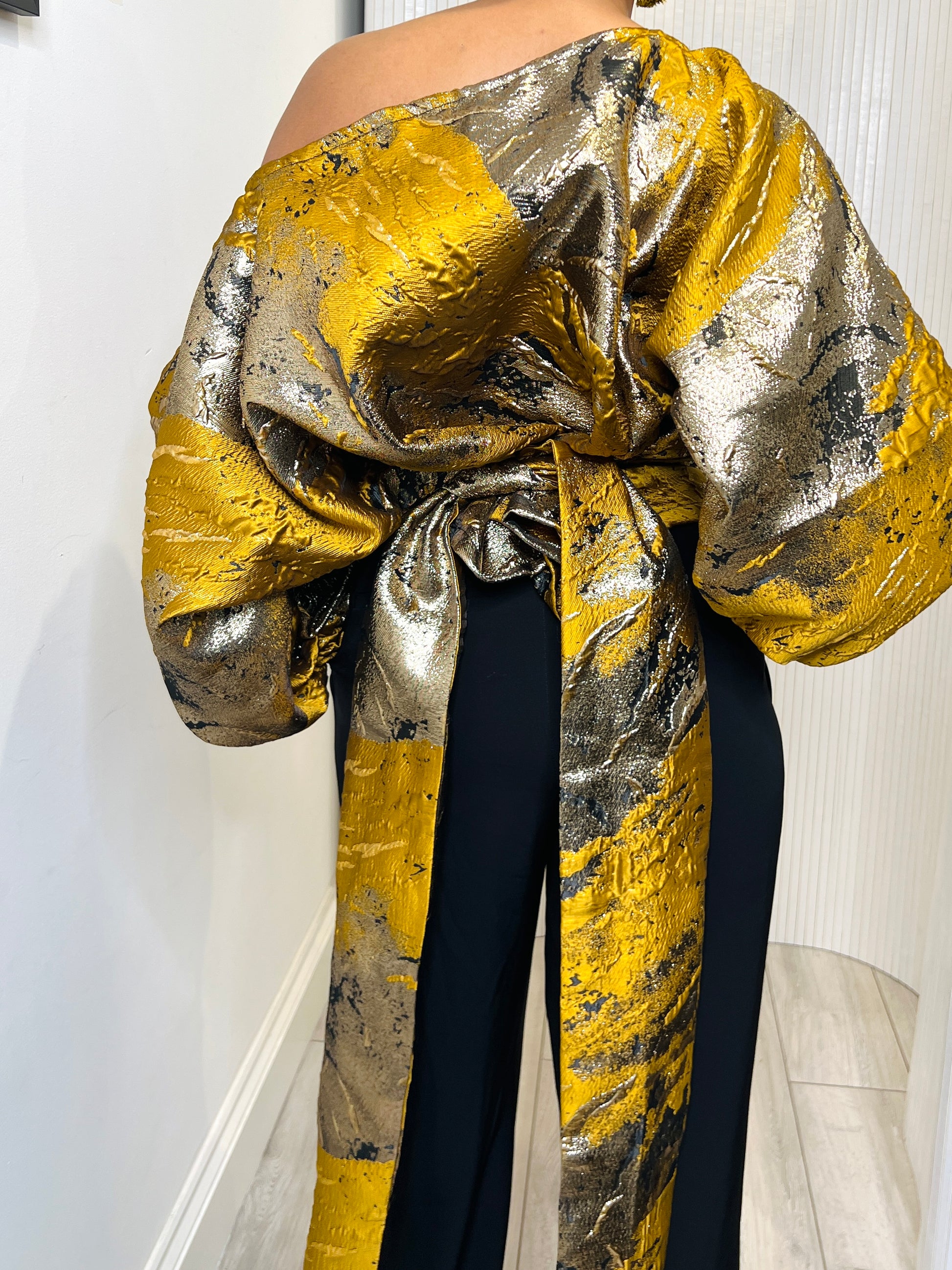 Mustard and gold metallic Jacquard Asymmetric Balloon Sleeve Blouse