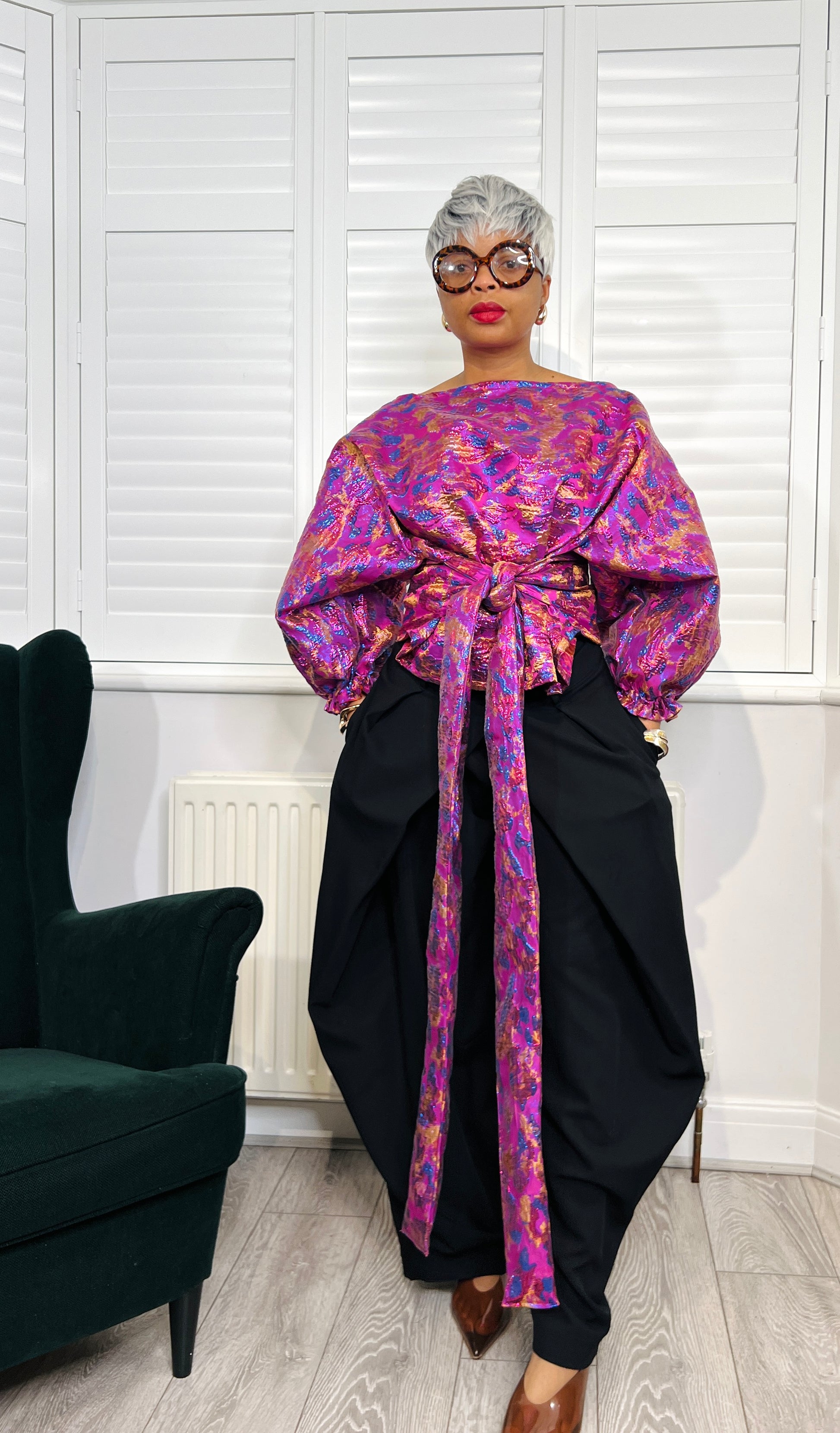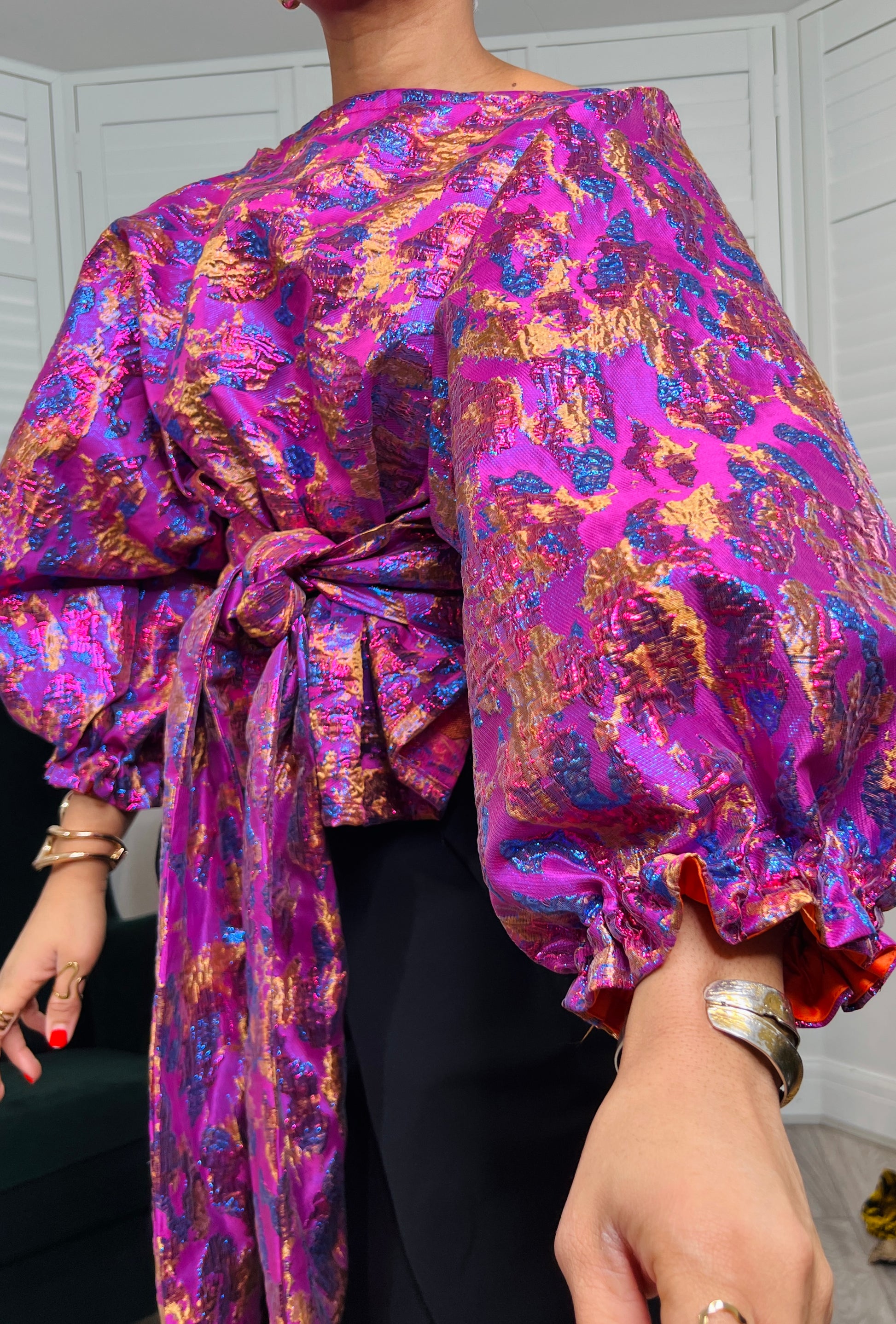 Pink leopard metallic Jacquard Asymmetric Balloon Sleeve Blouse