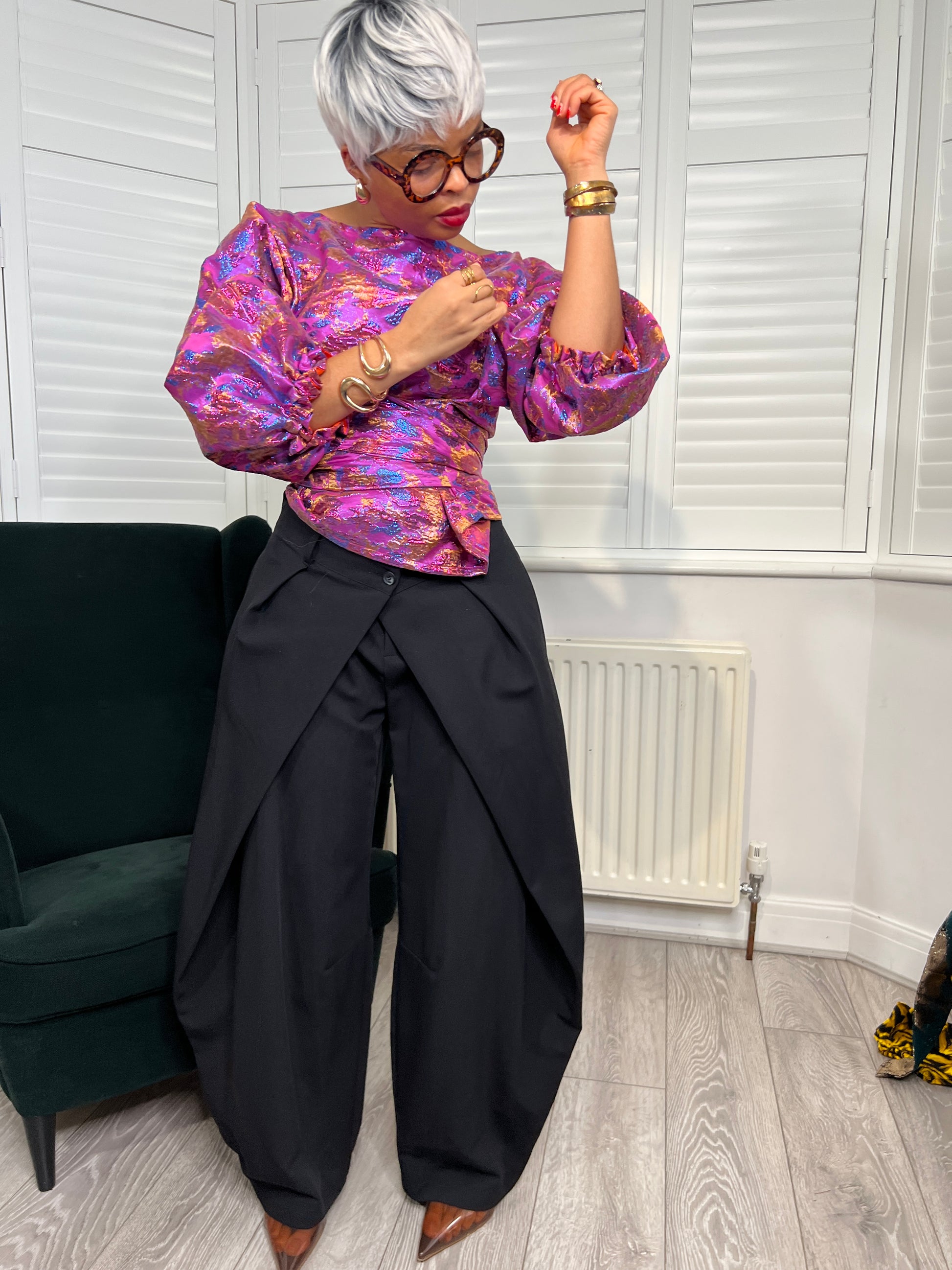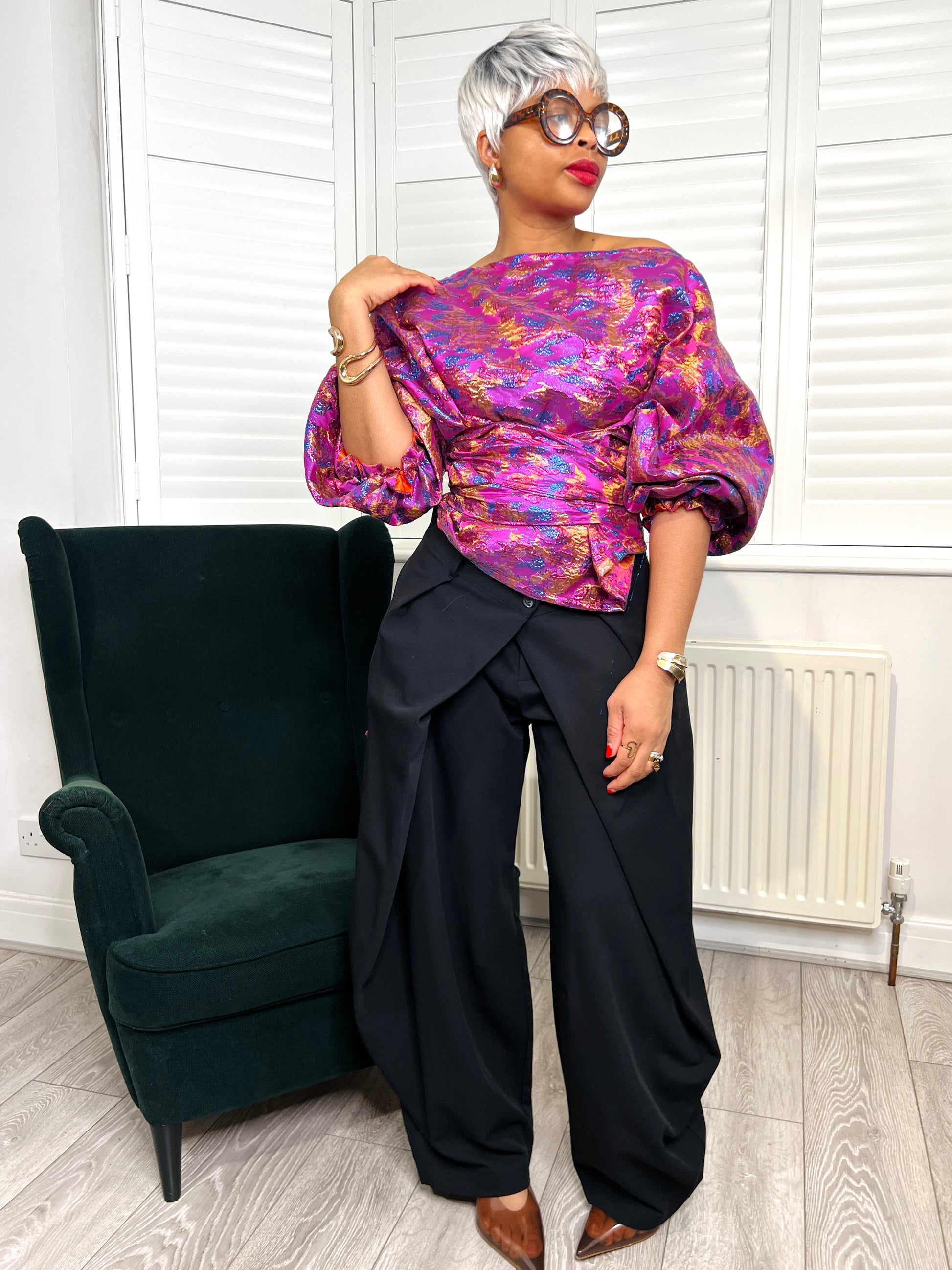 Featuring an asymmetric neckline and dramatic balloon sleeves, this top is perfect for the party season.